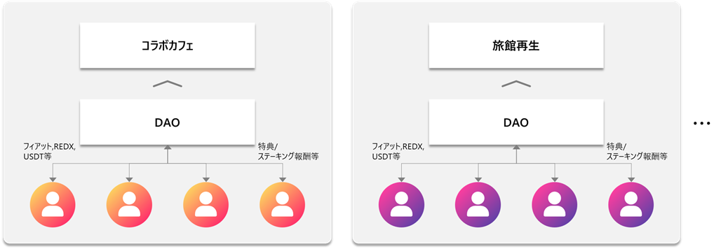 * DAOごとのトークンはREDXとの交換が可能で、成長に応じて取引所上場も視野に入れています。